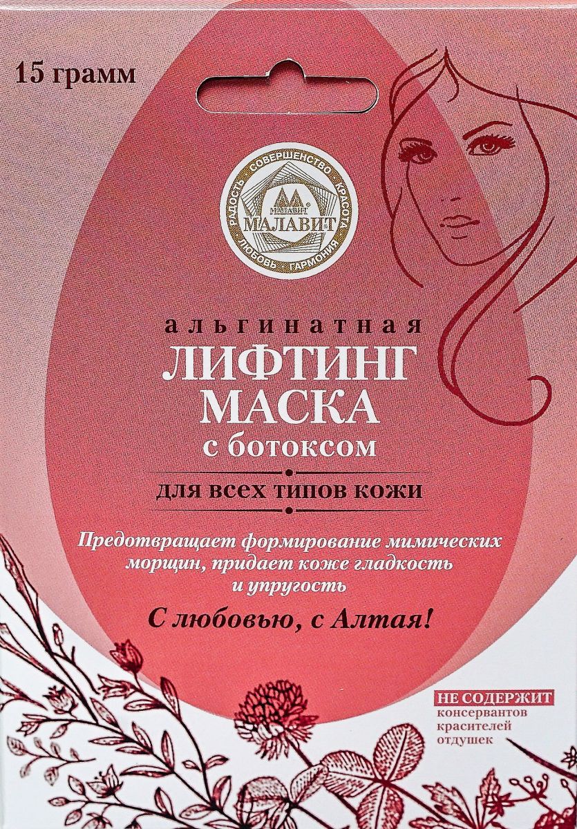 Альгинатная лифтинг-маска «Малавит» с ботоксом обладает антиоксидантными свойствами и предотвращает формирование мимических морщин, придает коже гладкость и упругость. В состав маски входит миорелаксант, который стимулирует выработку собственных коллагена и гиалоурановой кислоты. Рельеф кожи становится ровным, без всяких бугорков, высыпаний и прочих новообразований, улучшается цвет лица. Такая маска не только надежно скрывает имеющиеся признаки старения кожи, но и не допускает новых морщин за счет расслабления мелких мышц.