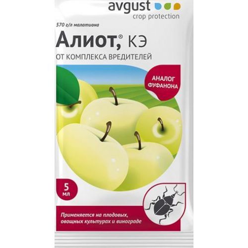 Алиот – один из современных препаратов, который применяется для уничтожения клещей, грызущих и сосущих насекомых на овощных, плодовых, ягодных, цветочных, декоративных культурах и винограде.