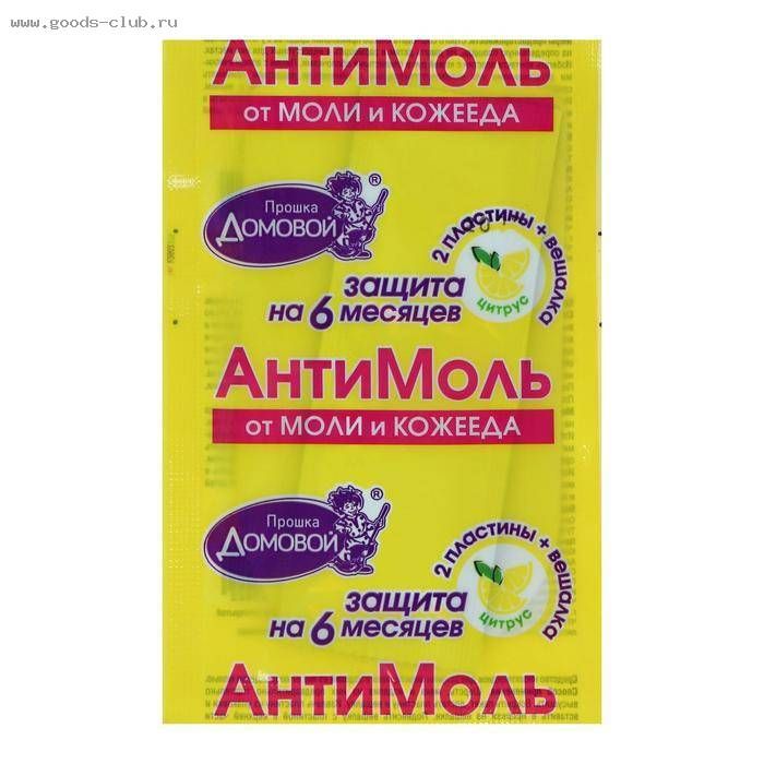 Пластины от моли "Домовой Прошка" Антимоль, с запахом цитруса, 2 шт + вешалка.Средство инсектицидное для защиты шерсти, мкха и изделий из них от повреждения молью.**Способ применения:** шерсть, меха и изделия из них предварительно тщательно высушить. Вскрыть пакет, достать пластину и вешалку. Извлечь пластину из упаковки и вставить в прорези на вешалке. Подвесить вешалку с пластиной в верхней части шкафа, либо разместить пластины в чемодане, пакете, ящике для одежды из расчета 2 пластины на 0,2-0,5 м.куб. объема. В помещении до 15 м.кв. использовать не более 8 упаковок средства.- Комплект 2 шт- антимоль- защита против моли- Средство против насекомых- Защита против насекомых- Средство против моли