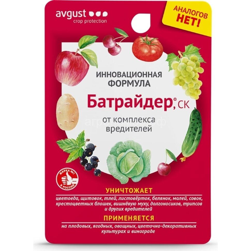 Описание Средство для защиты садовых растений от вредителей «Батрайдер N80» — универсальный инновационный препарат для борьбы с тлей, молью, цветоедом, крестоцветными блошками, колорадским жуком и большинством других вредителей. Предназначен для обработки овощей, плодово-ягодных растений, винограда.