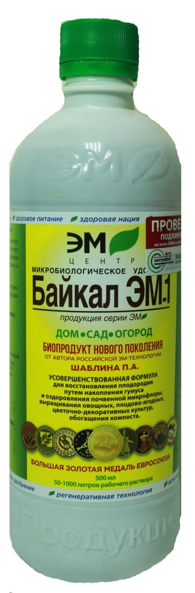«Байкал ЭМ-1» - готовый микробиологический препарат, включает симбиотический саморегулирующийся комплекс заведомо отобранных природных живых микроорганизмов: различных бактерий, в том числе фотосинтезирующих и молочнокислых, фиксирующих азот, сахаромицетов, продуктов их жизнедеятельности и жидкость, получаемую при культивировании. Данный готовый водный раствор культивируется промышленным методом, в отличие от концентрата, сделанного в домашних условиях. Улучшает почву путем восстановления гумуса, способствует росту экологически безопасного урожая, сохраняя природные взаимосвязи между землей и растениями.
