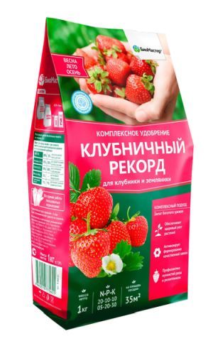 Минеральноне удобрение Клубничный рекорд содержит комплекс легкодоступных микроэлементов, жизненно необходимых для развития виктории, земляники и клубники ремонтантных и обычных сортов. В состав также входит уникальный компонент «активная органика», который является стимулятором роста растений и на 30% повышает эффективность подкормки. Удобрение поможет увеличить выход продукта и улучшить вкусовые качества ягод. Многокомпонентное удобрение Клубничный рекорд содержит 4 пакета агрохимических средств для разных этапов работы с клубникой. Удобрение Клубничный рекорд включает всё необходимое для правильного минерального питания растения в виде корневых и внекорневых подкормок, рассчитанных на внесение в течение всего сезона, и препарат для профилактики заболеваний. Упаковка Клубничный рекорд содержит два больших пакета с разным комплексным минеральным удобрением: первый - весенний - необходим для правильного и полноценного питания растения в фазе роста, цветения и плодоношения, второй – осенний - для поздней (после сбора ягод и до конца сентября), восстанавливающей подкормки растений; два малых пакета – один с иммуностимулирующим и микроэлементным комплексом, применяется перед цветением в виде опрыскивания, второй - для профилактики заболеваний, после цветения, опрыскиванием. Многокомпонентное удобрение Клубничный рекорд легко применять, оно быстро проникает в почву и усваивается растениями. Одна упаковка поможет садоводам заботиться о клубнике и землянике весь сезон, от первых весенних дней, до самой осени и получить великолепный урожай без лишних затрат и хлопот.