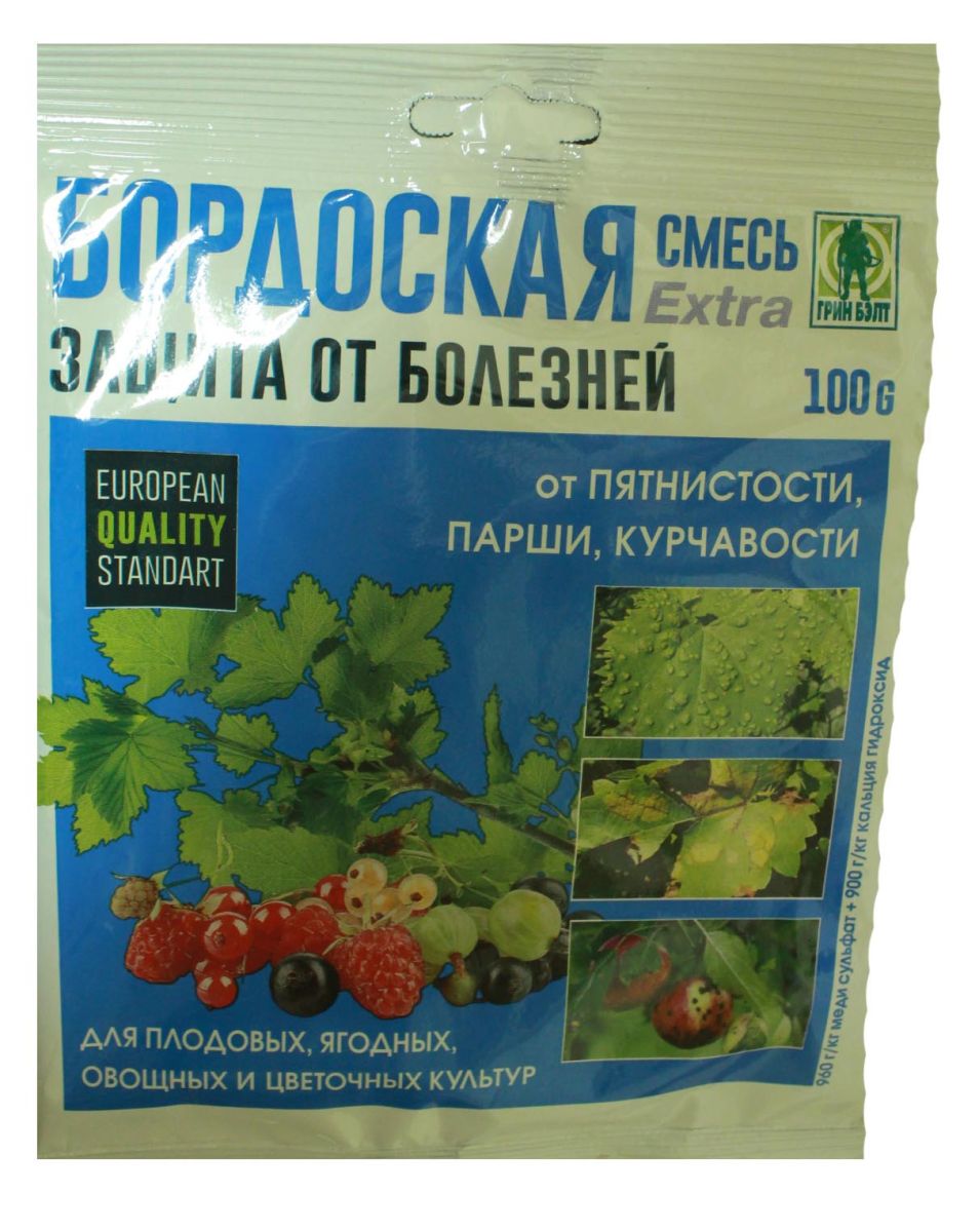 Описание: Бордоская смесь – фунгицид, 960 г/кг меди сульфат + 900 г/кг гидроксид. Средство для защиты плодовых, овощных, ягодных, бахчевых, цитрусовых, декоративных, цветочных и других культур от комплекса болезней (парши, пятнистости, фитофтороза, курчавости, ржавчины и др. болезней).