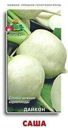 Корнеплод, относящийся к категории раннеспелых. Имеет округлую либо более овальную форму, кору белого цвета с гладкой поверхностью. В длину достигает 6–10 см, в диаметре 7–12 см, масса 200–600 г. Мякоть сочная, хрустящая. Преимущество Саши в его жаростойкости и холодостойкости. Он также устойчив к цветушности и бактериозу. Легко извлекается из почвы благодаря тому, что только наполовину погружен в нее.