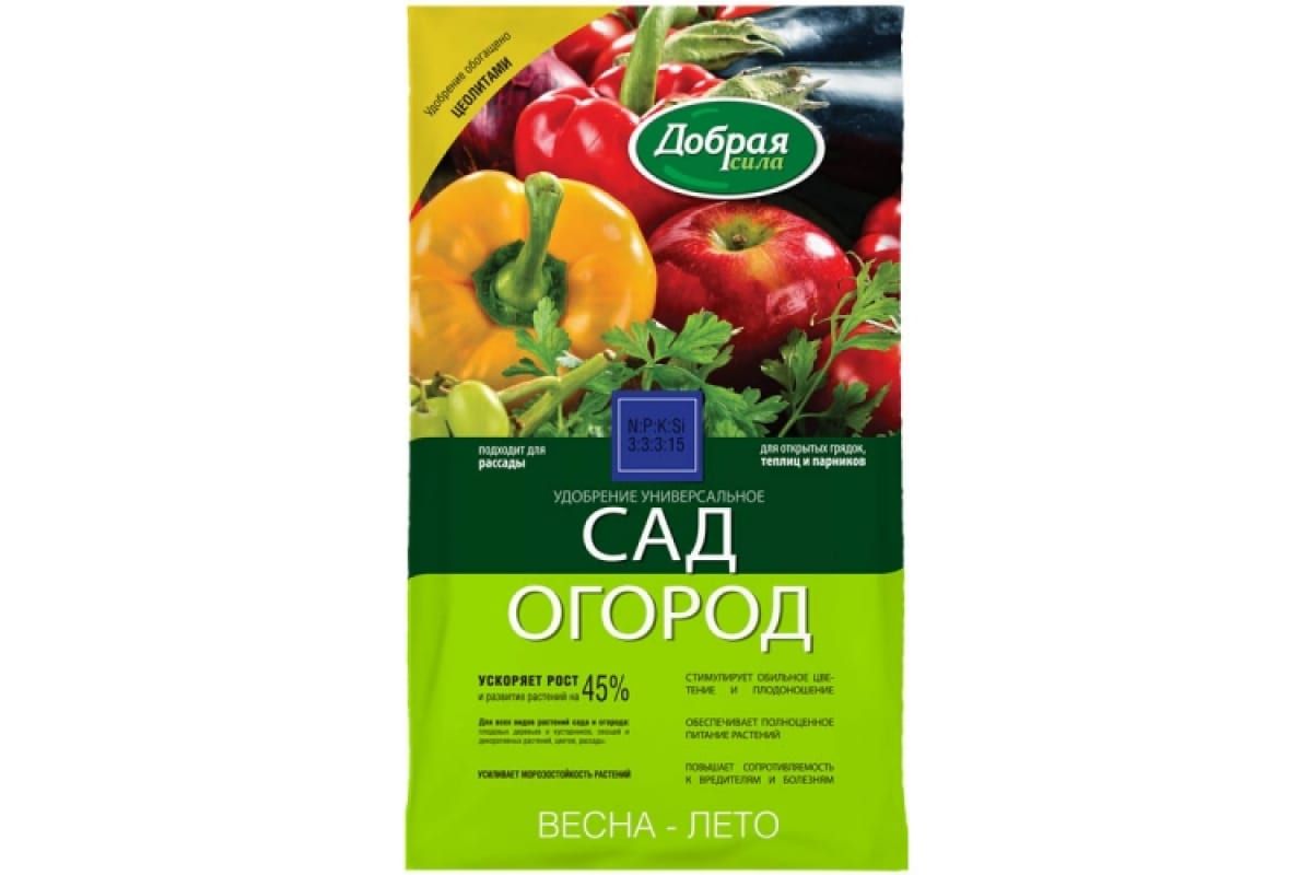 Универсальное удобрение Добрая сила Сад-Огород 0.9 кг рекомендовано для подкормки плодовых деревьев и кустарников, овощей и ягод, декоративных растений и цветов. Состав удобрения богат цеолитами, содержащими биодоступный кремний, который стимулирует рост растений, защищает их от вредного воздействия окружающей среды, увеличивает длительность хранения плодов.
