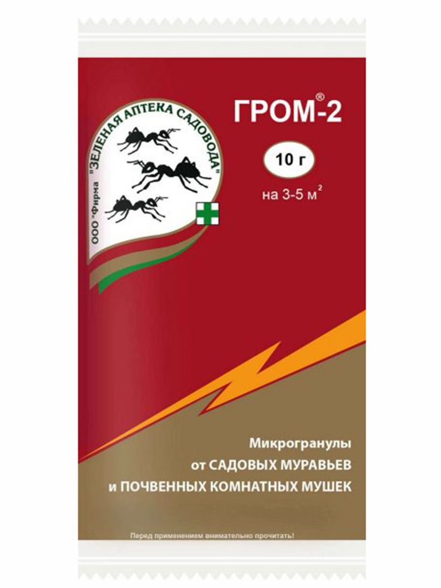 Средство от муравьев «Гром-2» — химический инсектицид, предназначенный для истребления муравьев, почвенных мошек, грибных комаров в горшках комнатных растений и на приусадебном участке. Для достижения результатов необходимо внести препарат в толщу почвы на глубину 1–2 см по пути следования муравьев или в местах скопления насекомых. Муравьи гибнут спустя 3–5 дней после контакта с действующим веществом препарата. Защитное действие сохраняется 2–3 месяца, достаточно купить препарат 1–2 раза на сезон. Упаковки в 10 г хватает для обработки 8–10 м2 почвы.