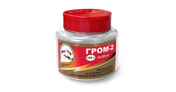 Средство от муравьев «Гром-2» — химический инсектицид, предназначенный для истребления муравьев, почвенных мошек, грибных комаров в горшках комнатных растений и на приусадебном участке. Для достижения результатов необходимо внести препарат в толщу почвы на глубину 1–2 см по пути следования муравьев или в местах скопления насекомых. Муравьи гибнут спустя 3–5 дней после контакта с действующим веществом препарата. Защитное действие сохраняется 2–3 месяца, достаточно купить препарат 1–2 раза на сезон. Упаковки в 10 г хватает для обработки 8–10 м2 почвы.