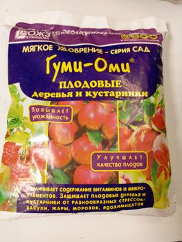 Удобрение гумусное "Плодовые деревья и кустарники Гуми-Оми", 1 кг. Органоминеральное удобрение с микроэлементами. Назначение: питание растений, повышение урожайности; повышение плодородия и улучшение структуры почвы; улучшение качества продукции. Содержит в пересчете на сухое вещество: органическое вещество не менее 15%; гуматы натрия 0,4-0,6%; макроэлементы, не менее: общий азот 5,0%; общий фосфор 6,0%; общий калий 5,0 %; микроэлементы: В 100-300 мг/кг; Сu 100-300 мг/кг.