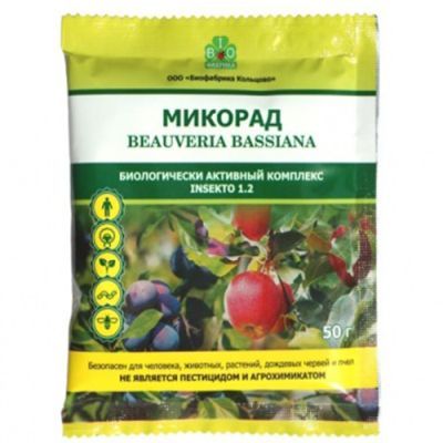 Микорад ИНСЕКТО (INSEKTO) 1.2 – новое запатентованное название МЕТАРИЗИНА современный биологически активный комплекс (БАК) микроорганизмов на основе энтомопатогенного гриба Beauveria bassiana, который способен существенно снизить численность насекомых-вредителей на обработанной территории (в том числе летающих, а также некоторые виды клещей). Биологические препараты на основе грибов, паразитирующих на насекомых-вредителях, используются для защиты сельскохозяйственных и садовых культур уже десятки лет и доказали свою высокую эффективность. Применяется для обработки почвы, опрыскивания растений и обеззараживания растительных остатков. Препарат нетоксичен, безвреден для животных и полезных насекомых, не является агрохимикатом.