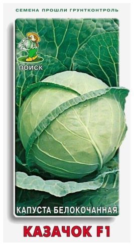 Капуста Казачок F1 б/к – высокоурожайный раннеспелый (106-112 дней от полных всходов) гибрид. Листовая пластинка слабоволнистая по краю, со слабовыраженными прожилками средней густоты. Кочан круглый, плотный, массой 0,8-1,2кг, не подвержен растрескиванию. Наружные кроющие листья зеленые без антоциана, на разрезе кочан белый с желтовато-кремовым оттенком, внутренняя кочерыга короткая, около 6см.