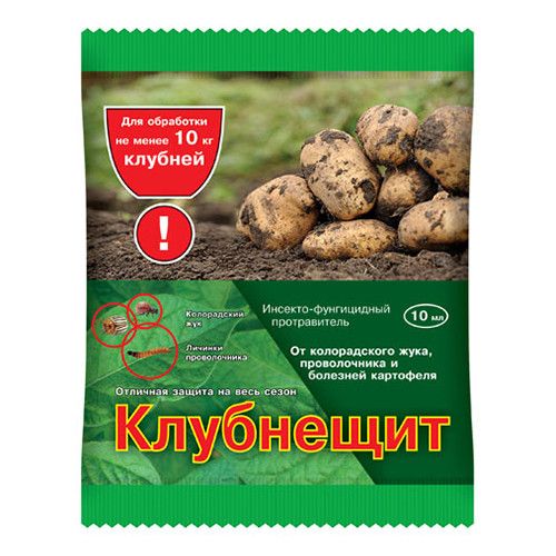 «Клубнещит» — надежная защита картофеля на весь сезон. Препарат для обработки клубней перед посадкой. Защищает картофель от проволочника, от колорадского жука и от комплекса болезней.