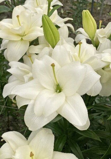 ЛА-гибриды (сокращение от лонгифлорум азиатик) – гибриды, полученные в результате скрещивания азиатских и длинноцветковых лилий.Их ароматные цветки крупнее, чем у азиатских лилий, и при этом лепестки и цветоносы менее хрупкие. Цветок - махровый белый, без пыльцы. Высота - 125 см.