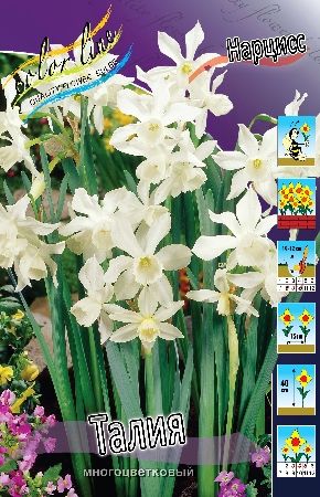 Высота нарцисса Талия достигает 20-25 см. Листья узкие, темно-зеленого оттенка, что придает цветку особенный контраст. Благодаря своей высоте и аккуратной форме прекрасно подходит в качестве комнатного выращивания, а также великолепно будет смотреться на садовой клумбе или же альпийской горке. Нарциссы Триандрус (Triandrus narcissus / Triandrus daffodils) – очень маленькая группа нарциссов, произошедших от видового нарцисса Триандрус. Отличительной чертой нарциссов Триандрус является небольшая корона и лепестки околоцветника слегка отогнутые назад. Нарциссы этой группы имеют небольшую высоту (не более 25-30 см), от 2 до 6 цветков на цветоносе и ранние сроки цветения, благодаря чему высоко ценятся в ландшафтной архитектуре, как незаменимые луковичные цветы для создания рано-цветущих композиций и в альпинариях.