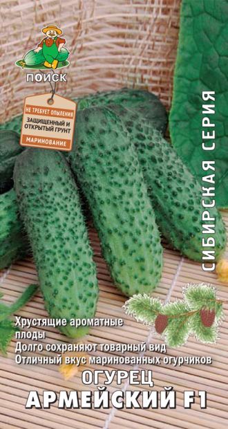 Огурец Армейский F1 - зеленцы долго сохраняют товарный вид, не буреют. Партенокарпический раннеспелый гибрид для выращивания в пленочных теплицах и открытом грунте. Период от полных всходов до первого сбора урожая от 43 до 45 дней. Плоды длиной 10-12 см, темно-зеленые, крупнобугорчатые, белошипые. Число женских цветков в узле преимущественно 4-5. Отличные вкусовые качества, плоды хрустящие и ароматные. Пригоден для потребления в свежем виде и для маринования. Высокая устойчивость к комплексу заболеваний