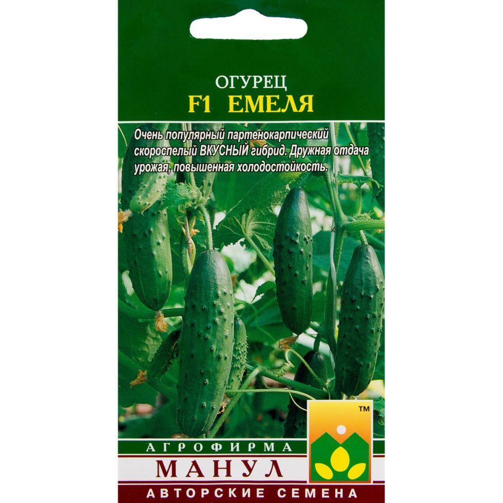 Емеля — партенокарпический гибрид с коротким периодом созревания (40-50 дней). Плоды созревают дружно. Урожайность сорта высокая, в среднем — 15 кг с 1 кв. м, что позволяет использовать его не только в индивидуальном хозяйстве, но и в промышленных целях.Куст недетерминантного типа, в высоту может достигать 2.5-3 м. Стебли крепкие, слабо- и средневетвистые. Листья имеют равномерный зеленый окрас. Форма листовой пластины близка к пятиугольнику, слегка закругленная, края слаборассеченные, прожилки четкие. На кусте преобладают листья среднего размера. В коротких междоузлиях в основном формируются цветы женского типа. Огурцы среднего размера, вырастают до 14-16 см со средней массой 130 г. Пропорциональное соотношения длины к ширине плода — 3:1.