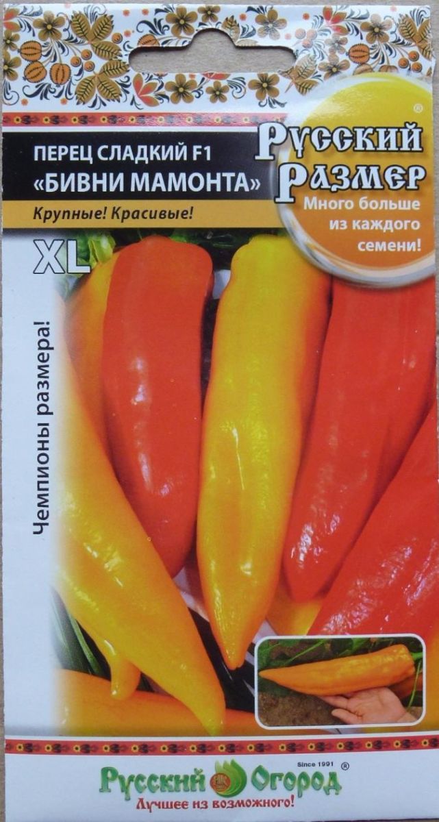 Сорт среднего созревания: от первых всходов до появления ярких желто-оранжевых плодов проходит 130 дней. Спелые перцы массивные – по 200–300 грамм, формой похожи на мощные остроконечные бивни, достигают 27 см в длину. Толщина стенок – 5–7 мм. Перец с насыщенным нежным вкусом, ароматный: свежие плоды – вне конкуренции. По мнению знатоков хорош в маринованном виде