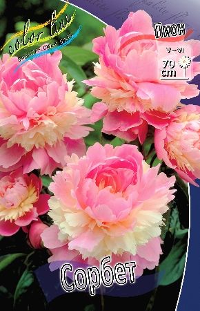 Сорбет —молочноцветковый пион с невероятно красивыми цветами диаметром до 20 см. Растение может достигать высоты 80 - 90 см. Цветки состоят из трех слоев нежно-розовых и кремовых бахромчатых лепестков. Цветоносы остаются устойчивыми до конца периода цветения. Листья ажурные, темно-зеленые, к осени становятся зелено-багряными.