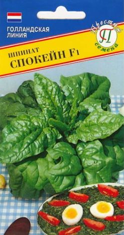 Шпинат Спокейн F1 – среднеспелый (55–60 дней от всходов) высокоурожайный гибрид, пригодный для посева весной и поздним летом. Полувертикальная розетка растения, состоящая из 6–10 крупных желто-зеленых листьев овальной формы, достигает размеров до 15 см в высоту и до 11 см в ширину. Черешки имеют среднюю толщину и длину.