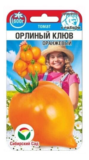 Томат Орлиный Клюв Оранжевый - растение индетерминантное, высотой до 2 м, формируется в 1-2 стебля. На каждом стебле закладывает до 6 сложных кистей с 4-6 крупными плодами массой до 600 г. Томаты сердцевидной формы, с ярко выраженным, скошенным носиком. Мякоть на изломе с малым количеством семенных камер, маслянистая, сочная, сахарно-сладкая.