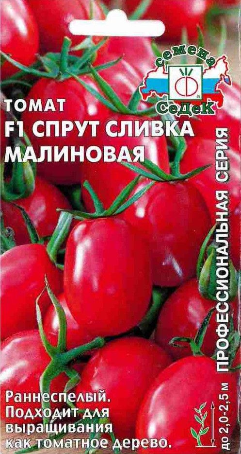 Томат Спрут Сливка Малиновая F1. Раннеспелый (95-100 дней) гибрид для защищенного грунта. Растение мощное, хорошо облиственное, до 2,0-2,5 м высотой. В зимних теплицах при наличии необходимых условий, его можно выращивать как томатное дерево. Плоды овальные, ярко-розовые, массой 15-20 г, плотные, сладкие, собраны в красивые кисти по 10-20 штук, пригодны для сбора кистями.