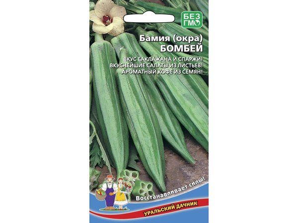 БАМИЯ БОМБЕЙ - однолетнее травянистое растение, высотой до 1,5 м. Плоды — многосемянные пирамидальные коробочки удлинённой формы, напоминающие стручки зелёного перца. По вкусу это растение удивительно похоже на баклажаны и спаржу. Бамия используется для приготовления супов, тушёных и варёных блюд, запеканок, её маринуют вместе с другими овощами, а также сушат и замораживают. Семена бамии обжаривают и используют вместо кофе, заваривают с ними специфический, жгучий напиток. С листьями растения готовят салаты и супы.