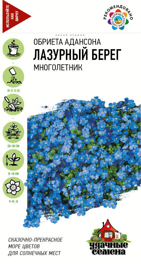 Крупноцветковая обриета -многолетнее растение, образующее распростертые куртинки до 8-10 см высотой, зимующие под снегом. Цветки до 1,5 см, сине-фиолетовые. Цветет в мае -июне, осенью наблюдается повторное цветение. Месторасположение только солнечное, даже в полутени обриета вытягивается и практически не цветет. Обриета предпочитает легкие, не слишком плодородные, некислые почвы. После майского цветения растения сразу обрезают, что способствует быстрому и более компактному росту. Отлично подойдет для создания альпинария.