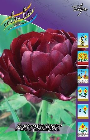 Тюльпан махровый поздний Антрацит – сорт с бордово-пурпурными лепестками. Каждый бутон возвышается над розеткой листьев на отдельном стебле. Диаметр бутона – около 10-11 сантиметров. Лепестки маслянистые, приятные, гладкие на ощупь.