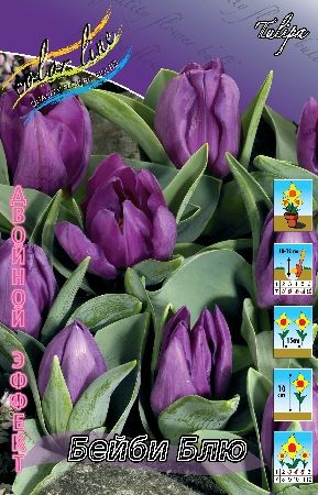 Тюльпан Бейби Блу (триумф) относится к особенной новой группе супер-тюльпанов "Двойной Эффект". Этот тюльпан класса Триумф + супер-карлик. Высота растения достигает до 20 см. Окраска цветка лилово-сиреневая. Высота бокала 6 см. Цветок не раскрывается полностью на солнце, сохраняя бокаловидную форму.
