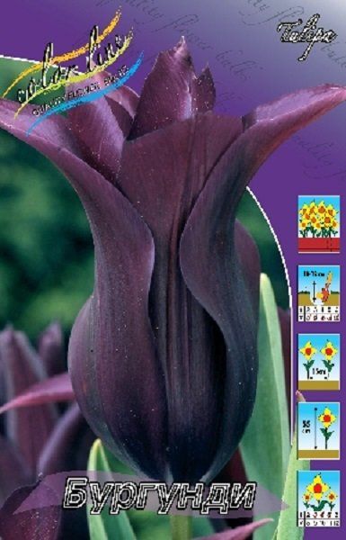 Тюльпан Бургунди относится к группе Лилиецветные. Высота растения 55 см. Цветок этих тюльпанов имеет необычную лилейную форму - удлиненные, узкие лепестки с заостренными кончиками, отогнутыми наружу. Окрас цветка черно-фиолетовый, высота бокала цветка 8-10 см. Устойчивый, здоровый сорт, продолжительность цветения - от 8-10 дней. Посадка - август, сентябрь, октябрь. Глубина посадки зависит от размера луковицы и составляет в среднем 8-12 см. Минимальное расстояние между луковицами должно вдвое превышать их диаметр. Период цветения - апрель - май. Предпочитают плодородную водопроницаемую почву с большим содержанием песка и плохо переносят переувлажнение. Лилиецветные тюльпаны любят солнечные места, однако хорошо растут и в полутени. Сорт универсального назначения. Великолепный выбор для миксбордеров, клумб и срезки.