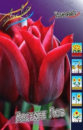 Тюльпан Ластинг Лав относится к лилиевидным сортам, характерной особенностью которых является узкая вытянутая форма бокала и изящно изогнутые лепестки с сильно заостренными кончиками. В роспуске чаша образует звезду. Особенностью данного сорта является роскошный рубиновый цвет бокала и мягкие волнистые края листьев, подчеркивающие геометрически точеные формы цветка.