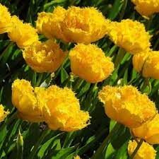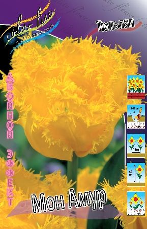 Тюльпан бахромчатый махровый Мон Амур - пышный солнечно-жёлтый цветок с густой игольчатой бахромой по краю лепестков. Очень эффектный сорт. Бахромчатые тюльпаны отличаются особой прочностью лепестков, и благодаря этому они особенно устойчивы к неблагоприятным погодным условиям и сильным ветрам. Превосходно держат форму в срезке. Также используются для выгонки и украшения клумб.