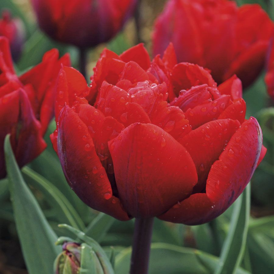 Тюльпаны - многолетние травянистые луковичные растения семейства лилейных. Они заслуженно пользуются широкой популярностью и распространены во всех странах с умеренным климатом. Тюльпаны являются наиболее красивоцветущими среди весенних цветов и к тому же относительно неприхотливы в культуре. Махровые поздние тюльпаны - имеют густомахровые цветы, внешне напоминающие цветы пионов, поэтому их часто называют пионовидными. Махровые поздние тюльпаны имеют крепкие цветоносы высотой 45-60см. От Махровых ранних эти тюльпаны отличаются более крупными размерами всего растения и поздним сроком цветения. Махровые поздние тюльпаны имеют один недостаток: их тяжелые цветки часто обламываются от дождя и ветра. Это нужно учитывать при посадке таких тюльпанов и отводить им хорошо защищенные участки или подвязывать. Окраска тюльпанов этого класса варьируется от чисто-белой до черной, может быть и двухцветной. Используются в основном для выращивания в садах и парках. Размножаются они довольно хорошо. Местоположение: участок должен быть расположен в солнечном месте и защищен от ветра. Важно, чтобы он не имел неровностей, в которых весной и осень будет застаиваться вода - это может привести к вымоканию и загниванию луковиц. Почва: тюльпаны - растения довольно неприхотливые и могут мириться с любой садовой почвой, но наилучшей для них является рыхлая, хорошо дренированная, умеренно увлажненная, т.е. суглинистая и супесчаная почва с нейтральной или слабощелочной реакцией. Тяжелую суглинистую почву можно улучшить добавлением песка и торфа. Посадка: тюльпаны высаживают осенью, когда температура почвы на глубине 10 см опустится до 9-10°С, в средней полосе это вторая половина сентября - начало октября. Глубина посадки для садовых тюльпанов – 15-20см, ботанических -10см. Расстояние между растениями 10-20см. Луковицы садовых тюльпанов нужно выкапывать каждый год. Место посадки тюльпанов лучше менять 1 раз в 4-5 лет. Размножение: луковицами-детками при выкапывании. Использование: для озеленения, на срезку. Ред Принцесс - густомахровый, пионовидный темно-красный с более светлыми краями и редким зеленым штрихом на кончиках лепестков, высота 30 см.