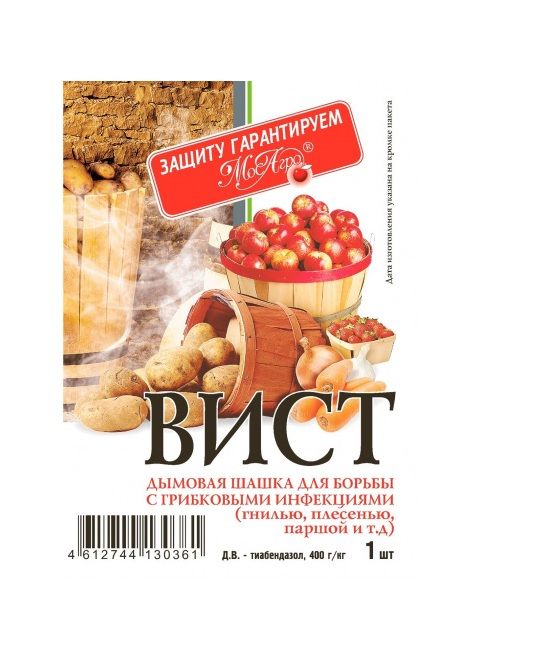Дымовая шашка 5г. Защищает 500кг продукции, 25 куб. м помещений. Для борьбы с грибковыми инфекциями (гнилями, плесенью, паршой и др.) Содержит тиабендозол – системный фунгицид, который обладает защитными лечащими свойствами. Для борьбы с грибковыми инфекциями (плесенью, паршой, гнилями) при хранении плодоовощной продукции, а также профилактической обработке помещений (погребов, подвалов, теплиц, оранжерей, транспортных средств, зернохранилищ и др.). Одна шашка рассчитана на 25 куб. м пустых хранилищ или на 500кг картофеля, овощей. Период защитного действия 6-8 месяцев. Применяется препарат Вист в любой период хранения с/х продукции. Лучшие результаты достигаются при обработке сразу после закладки продукции на хранение (до 7 дней). Клубни картофеля обрабатываются дважды: перед посадкой и при закладке на хранение.